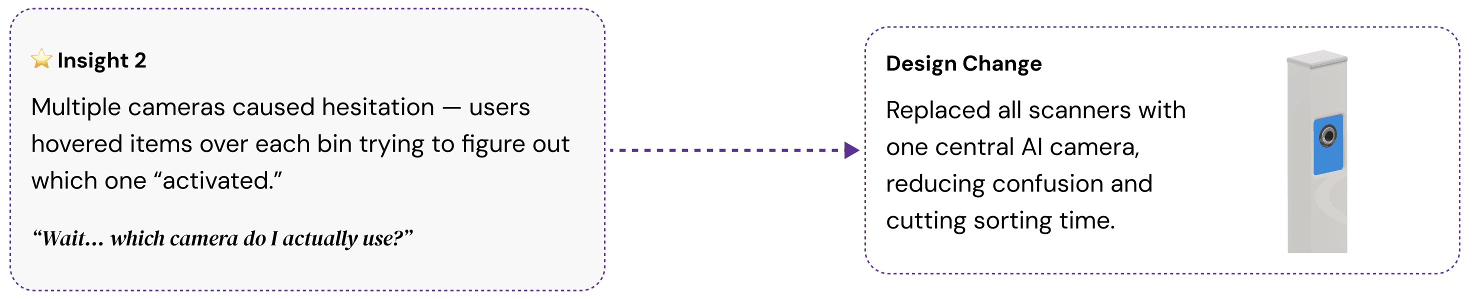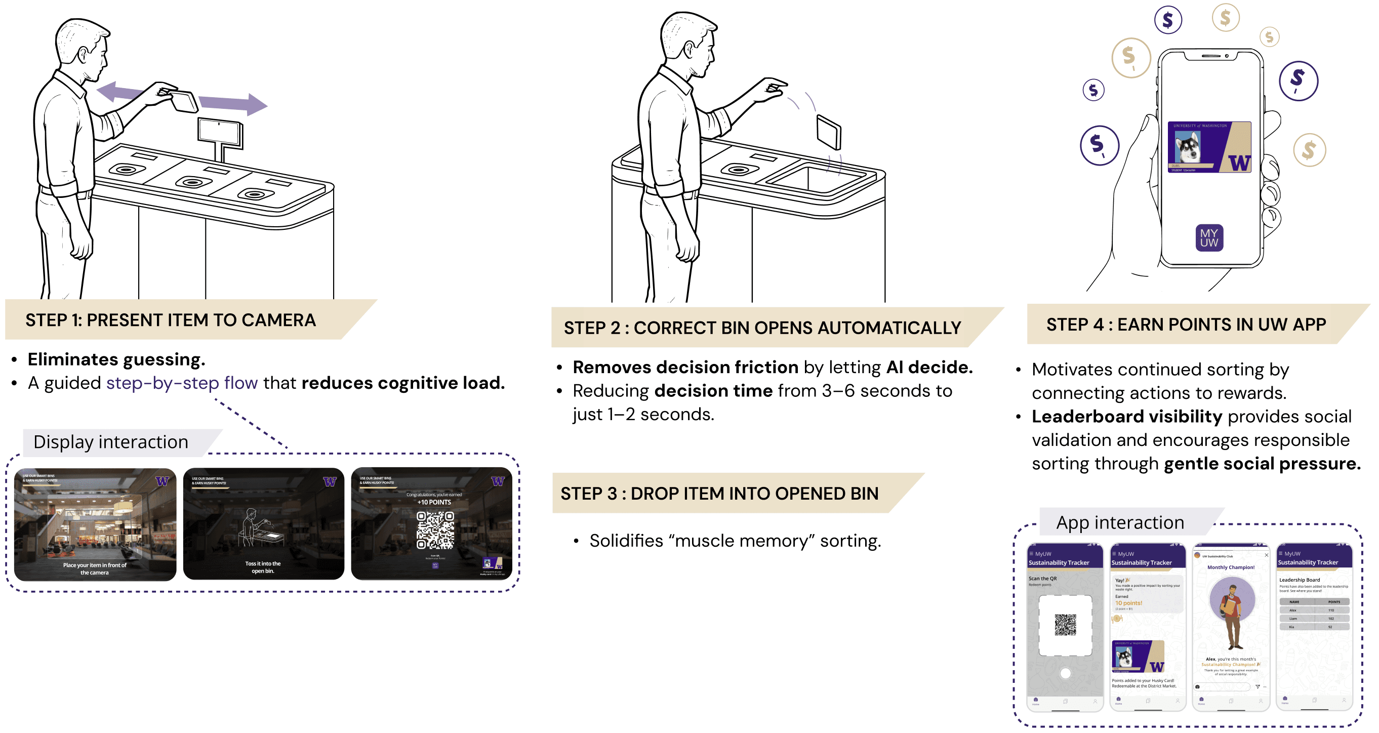 Added one centralized guidance screen with a clean, linear 3-step interaction. Scan item → Correct bin opens → Scan OR code → Earn point