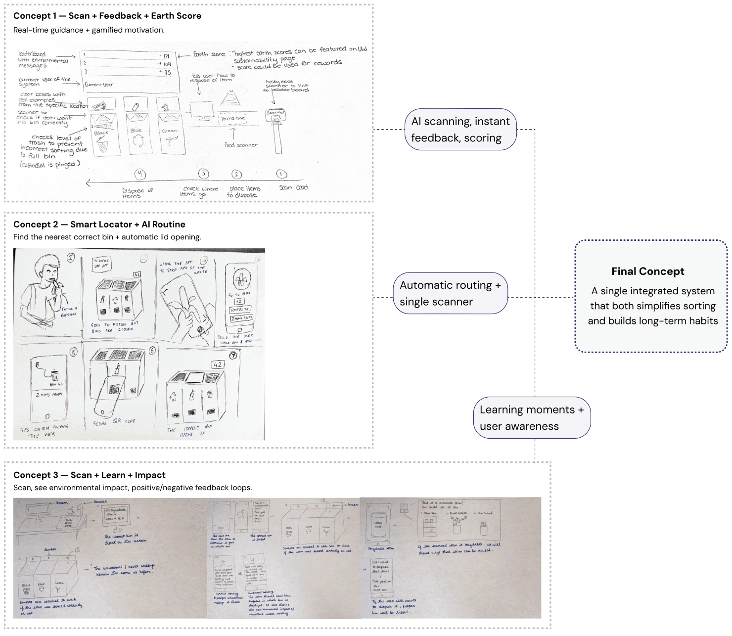 We brainstormed 24 sketches, grouped them through affinity mapping, and refined them into 3 core concepts.
